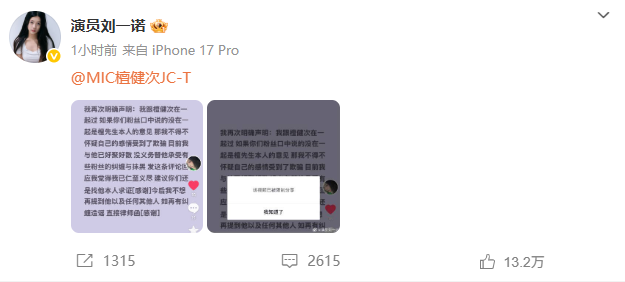 1�日,女演员刘一诺在社交平台发文@MIC檀健次JC-T ,还晒出截图明确称两人在一起过,目前已经好聚好散。她还表示,没必要承受粉丝的纠缠与抹黑,“如再有纠缠造谣,直接律师函。”